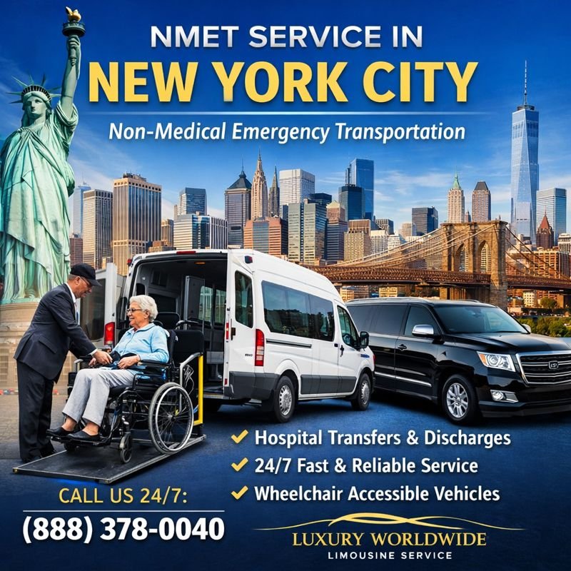 Book your NMET transportation in New York City with Luxury Worldwide Limousine Service, a trusted provider of professional, non-medical emergency transport. Our team is available 24/7 to arrange fast, reliable transportation across all NYC boroughs. With experienced drivers, well-maintained vehicles, and a focus on safety and punctuality, we ensure every NMET ride is handled with care, comfort, and efficiency you can rely on.